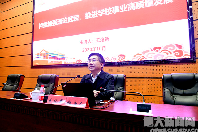 王焰新从学懂、弄通、做实三个方面切入,分享了对第三卷背景的深刻理解,牢牢掌握新思想的基本立场观点和方法,以及如何将新思想贯穿到推进学校事业高质量发展的始终。他通过解读《深化新时代教育评价改革总体方案》,要求党员同志们要联系国家创新驱动发展、高等教育发展趋势、自然资源行业变化、地学理论技术和方法变革,以及学校的历史方位和现实状态等实际,实事求是,找准客观基点,科学判断形势,以永远在路上的姿态和心态不断去追求卓越的境界。