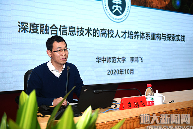 李鸿飞向与会人员讲解了信息技术对传统教育的冲击,教育信息化的基本概念、时代需求与国家战略,他分享了华中师范大学近年来全面推进信息技术与教育教学深度融合,构建以学生为中心的连接、共享、自主、开放、适切的新型人才培养体系的具体实践,介绍了该校在教育信息化推进过程中的工作思路、实施路径和落地成效。他结合新冠疫情下教育的应对与反思,介绍了后疫情时代教育信息化的发展方向及目标。
