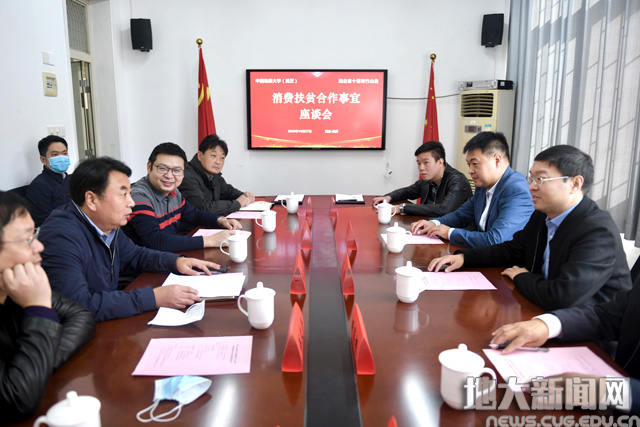10月27日,竹山县人民政府副县长范奇,扶贫办主任明昌根来校与校社会合作办公室主任陈华荣、后勤保障处处长王文起对接消费扶贫专柜设立事宜。