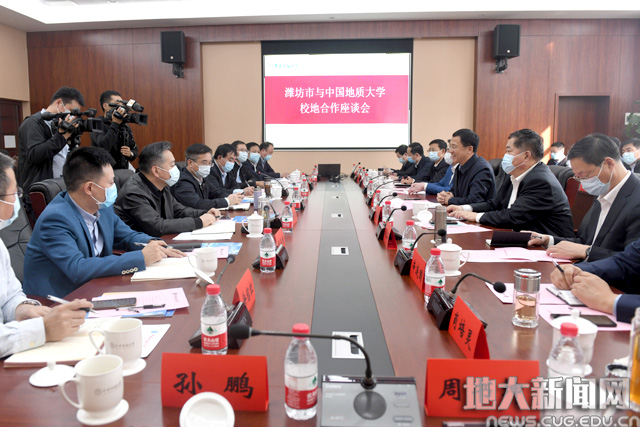 地大新闻网讯(记者庞伟红 摄影张玉贤)10月22日,我校与山东省潍坊市校地合作座谈会在南望山校区举行。校长王焰新、副校长赖旭龙,潍坊市委书记惠新安、副市长刘建国,及双方相关单位负责人参加座谈。会议由赖旭龙主持。