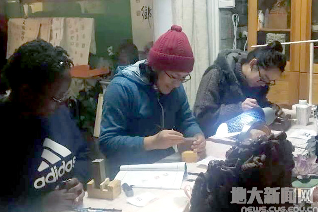 鲁比和泰国籍、坦桑尼亚籍篆刻班同学在课余时间练习篆刻