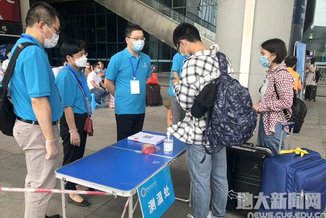 为了迎接新生报到,少不了工作人员的辛苦与付出。9月12日一大早,为迎接新生们的到来,身着地大蓝的迎新老师们,早早地来到武汉各大车站,消毒、引导,一切有条不紊。为方便家长和学生准确找到集合地点,工作人员提前准备了迎新海报和指示牌,还贴心准备了座椅和矿泉水,供家长和学生休息、等候。
