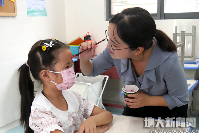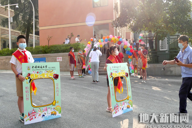 老师带领学生书写“地大附校”四个大字,开启对学校的认知。学生一笔一画,认真写下人生第一笔。