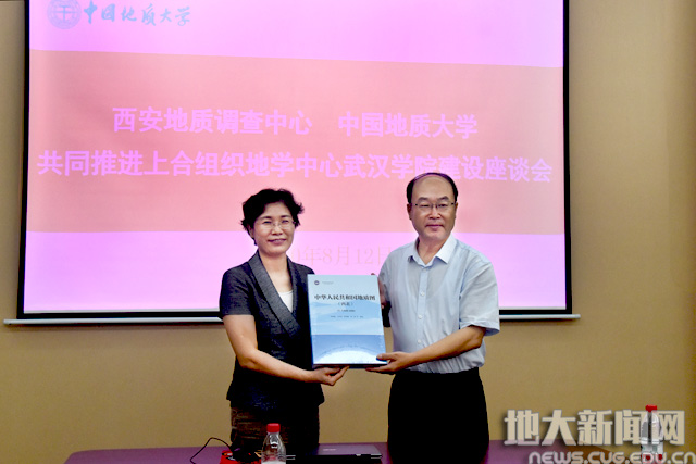 李志忠代表西安地质调查中心向学校捐赠黄河中上游图集和1:150万西北地质图,黄晓玫代表学校接受捐赠。