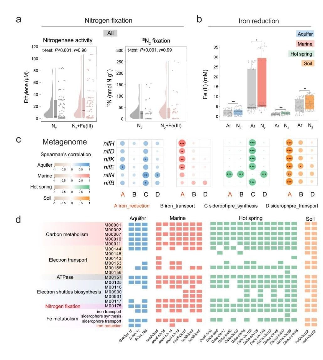 微生物固氮(MNF)和异化铁还原(DIR)是自然环境中常见的生物地球化学过程。氮气(N2)虽占大气近80%,却需通过MNF转化为铵态氮才能被生物利用,DIR则驱动有机质氧化与碳周转。二者分别是维持环境中氮和铁元素有效性的核心过程。然而,这两大核心过程之间是否存在相互协同,其代谢机制如何在不同物种乃至生态系统中体现尚未被科学界深入探究。本研究通过微生物种内和种间纯培养实验以及环境样品微宇宙模拟,结合同位素示踪、转录组、宏基因组、宏转录组学技术全面揭示了MNF和DIR的协同效应和作用机制。
