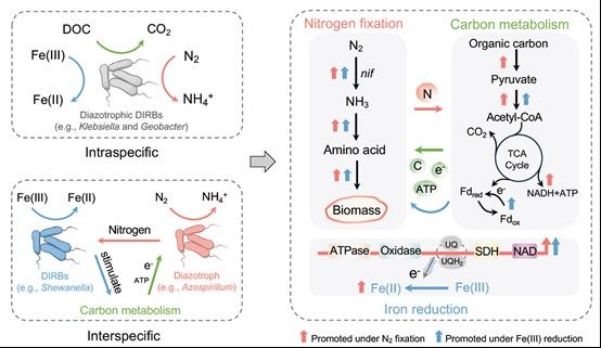 研究发现MNF和DIR之间进行着紧密的相互协同作用。固氮可使铁还原速率提高近15倍,而铁还原对微生物固氮量贡献高达100%。固氮作用显著上调了微生物中多个参与碳代谢途径的基因转录水平,包括糖酵解、三羧酸循环以及电子传递链成分,微生物量显著提高,从而促进了Fe(Ⅲ)的还原;同时,Fe(III)的还原通过改善细胞的能量平衡来增强MNF:在发酵型铁还原菌中,Fe(III)在有机底物发酵过程中作为次级电子受体,增加了能量的产生,而在呼吸型铁还原菌中,Fe(III)作为直接电子受体,加速了电子传递和ATP合成,从而支持了N2固定。