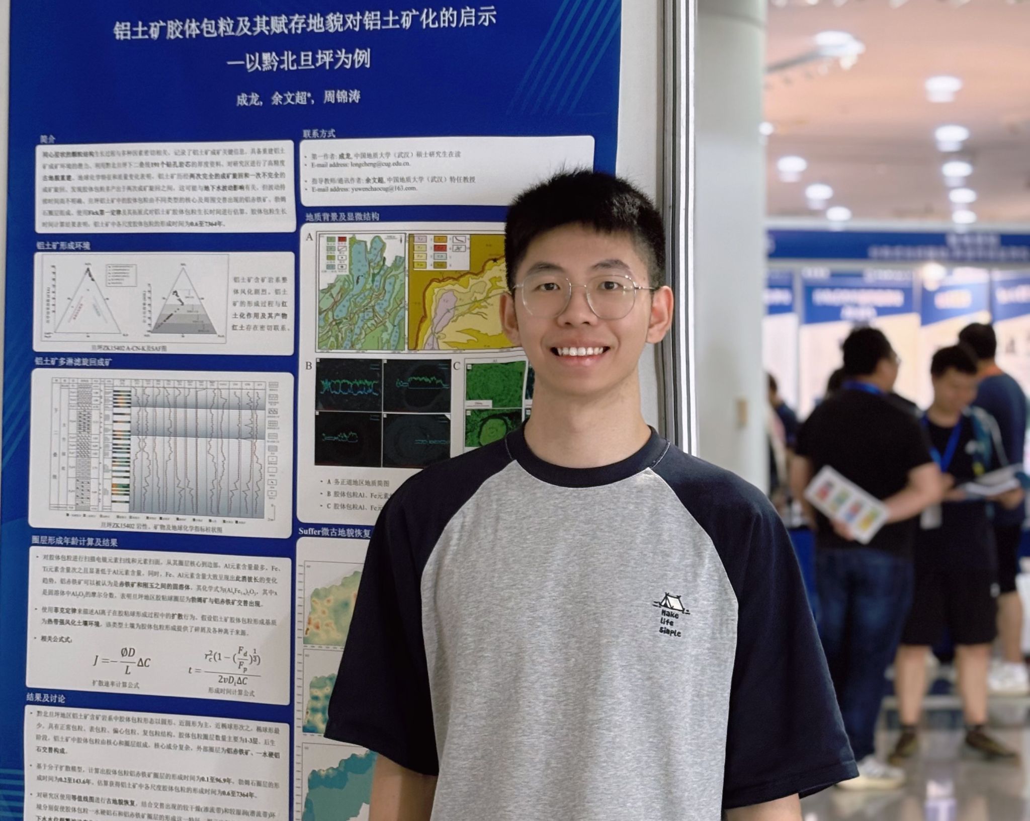 双脚沾满泥土,科研对接一线。成龙的研究主要是聚焦于铝土矿中的特殊胶体包粒结构,为了更好地了解这种特殊结构的产出层位和地质历史时期的产出环境,他跟随导师及贵州省地矿局106地质大队的工程师们,多次勘查贵州地区的铝土矿典型剖面,系统采集野外和钻孔岩心样品。通过精细分析,他发现胶体包粒常出现在高品位与低品位铝土矿的过渡地带,其形成与地下水的波动密切相关。这一认识,为野外快速锁定找矿有利区提供了新的标志,有望改变传统的元素分析的工作模式,助力勘探效率的提升。