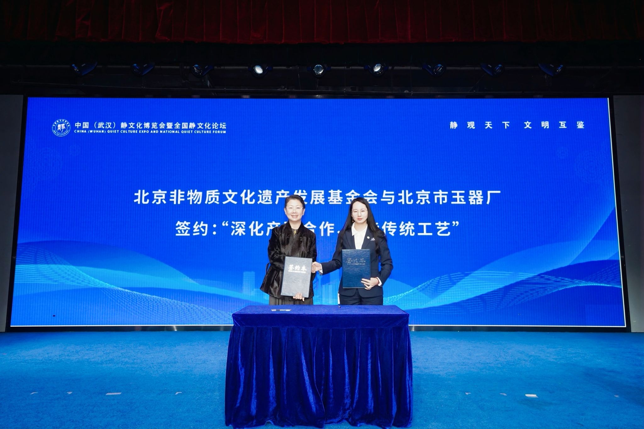 开幕式上,北京非物质文化遗产发展基金会专职副理事长兼秘书长白芬与我校珠宝学院院长尹作为签署“非遗进校园”合作协议。此次合作将系统构建非遗传承的育才体系,让文化基因在青年心中生根发芽,为民族未来注入深沉力量。白芬与北京市玉器厂厂长刘春明签署“深化产融合作,赋能传统工艺”战略协议。该协议旨在打通技艺传承与市场价值的通道,推动指尖技艺向指尖经济实现创造性转化,为非遗技艺的活态传承提供坚实保障。
