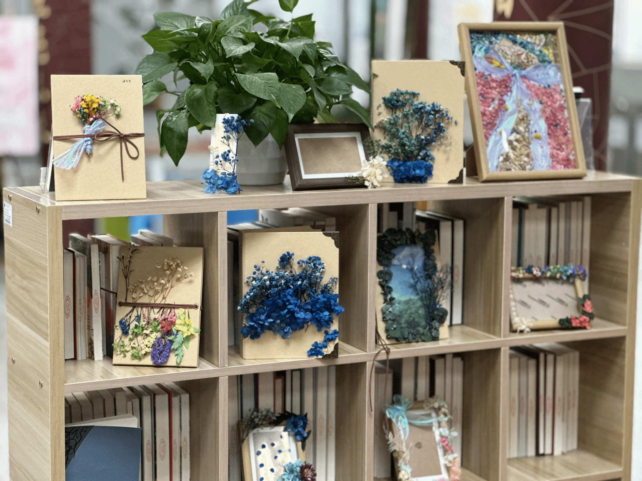 在废旧书封花韵创意DIY区域,同学们以图书馆图书加工过程中产生的废弃书封为创作基底,搭配干花、古诗词素材与笔墨,巧手制作书签、装饰画、手账本等文创作品。花韵点缀书香,旧物焕发新生,大家在动手创作中放慢节奏、舒缓心情,在动手实践中感受“惜物减废、变废为宝”的乐趣。