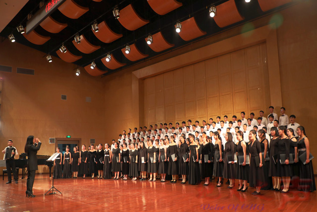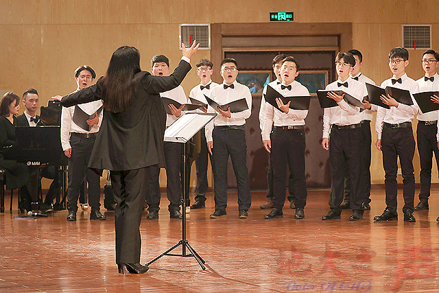 下半场,全女声的歌声中,《乘着歌声的翅膀》《大海故乡》曲调婉转悠长,深情柔美。全体集训女生演唱《菩萨蛮》,意境深远。一曲《月亮代表我的心》,当熟悉的旋律响起时,男生从侧门款款而下,站立在座位席间,与舞台上的女生互动,将一首老歌注入新的活力。