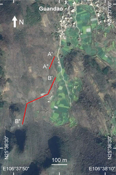 图1. 贵州关刀村的谷歌地球卫星图,红线为剖面位置