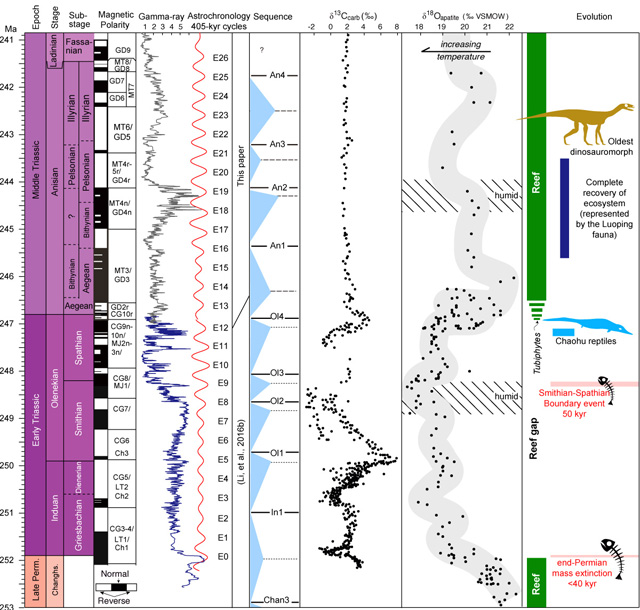 图3. 三叠纪生物复苏期的1000万年综合地质年代表