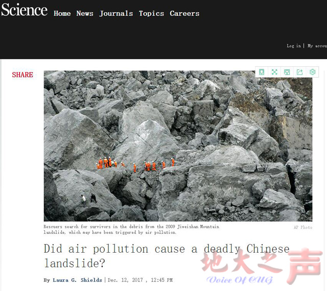 针对论文中的一些关键问题及下一步的研究计划,《科学》近日分别对该文的两位作者—我校张明副教授和新西兰地质与核技术研究所的Mauri McSaveney教授进行了电话采访,并邀请了美国华盛顿大学的Alison Duvall和科尔盖特大学的Richard April两位学者分别对该成果进行了点评。他们一致认为,该成果开创了高速远程滑坡启动机理新的研究方向,酸雨所引起的方解石溶解和有机物分解是滑坡研究中必须考虑的问题。在北美、欧洲和其它亚洲国家,存在类似的地质背景和严重的酸雨污染,因此,也存在像鸡尾山滑坡类似的风险,必须引起重视。该报道以《是酸雨导致了重庆武隆鸡尾山高速远程滑坡吗?》为题发表在《科学》官方网站上。相关链接:http://www.sciencemag.org/news/2017/12/did-air-pollution-cause-deadly-chinese-landslide