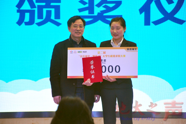 (地大之声通讯员王富珍 白振洋)12月12日,第二届“我选湖北•聚英才”大学生模拟求职大赛举行,我校材料与化学学院应用化学专业2015级本科生王荟同学以优异的成绩夺得冠军。