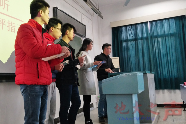 本次参与校级答辩51个作品涵盖地球科学(包含两类)、工程环境化学、人文社科和信息科学发明五大知识领域。报告采取5+3的答辩模式,同学们纷纷展示自己的学术科研成果,体现出较高的学术水平。评委老师根据论文选题、论文创新性及成果应用价值、报告内容、现场表现等对参赛团队进行提问并打分。