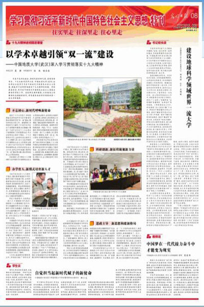 在文图并茂的新闻综述《以学术卓越引领“双一流”建设——中国地质大学(武汉)深入学习贯彻落实十九大精神》中,从“不忘初心,新时代呼唤新使命”“办学育人,新模式培育新人才”“科研创新,新征程凝聚新力量”“思政主导, 新思想构建新格局”四个部分进行深入报道。文中写道:“十九大胜利召开以后,中国地质大学(武汉)全体师生认真学习习近平新时代中国特色社会主义思想,掀起学习宣传贯彻落实十九大精神的热潮。学校党委号召,用习近平新时代中国特色社会主义思想全面指导学校工作。全校师生满怀激情,以昂扬向上的精神状态拥抱新时代,书写建设地球科学领域世界一流大学新篇章。”