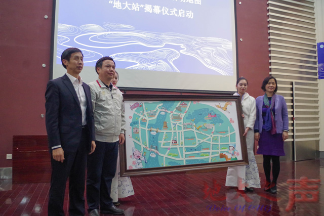 武汉市和我校双方代表上台共同为“黄鹤楼文化进高校系列地图”贴上地大站地标,黄鹤楼公园向我校图书馆赠送书籍《黄鹤楼文丛》。