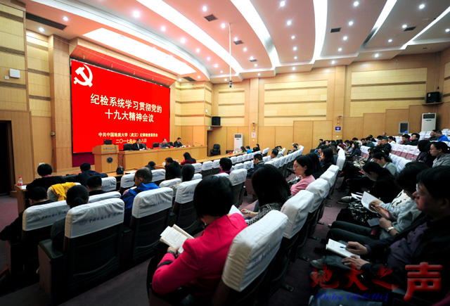 (地大之声通讯员王长虹 摄影张玉贤)11月8日下午,学校在迎宾楼报告厅召开全校纪检监察工作会议,学习贯彻党的十九大精神。党委书记何光彩,党委副书记、纪委书记成金华,校纪委委员,二级党组织纪委书记、纪委委员、纪检委员,教职工党支部纪检委员,纪委办监察处全体纪检监察干部等参加了会议。