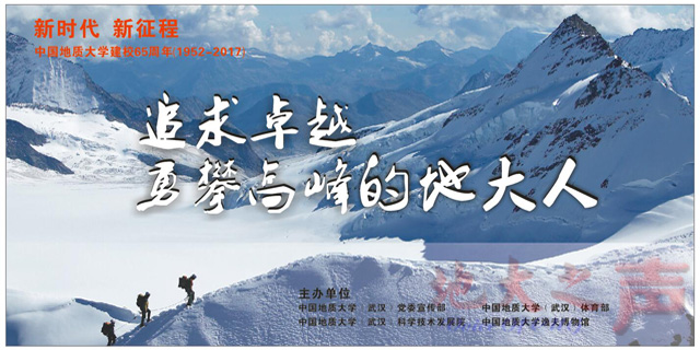 (地大之声通讯员彭磊)为了深入学习宣传贯彻党的十九精神,庆祝中国地质大学65周年华诞,展现地大人勇攀高峰、追求卓越的精神,由校党委宣传部、体育部、科学技术发展院和逸夫博物馆主办的《追求卓越勇攀高峰的地大人》专题展览近期将与观众见面。