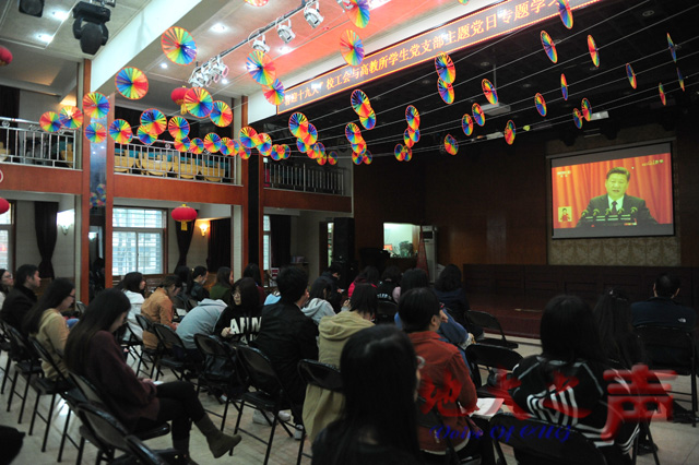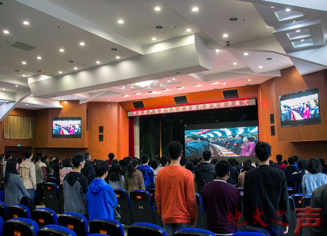 党委学工部、党委研工部、团委等组织学生在弘毅堂集中收听收看 马卿皓摄