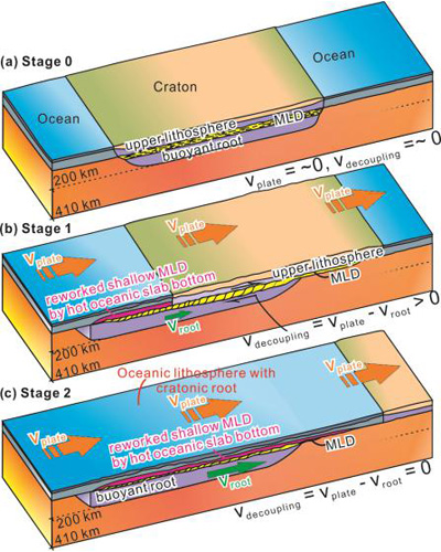 岩石圈为地球外部固态圈层,自上而下由地壳和地幔盖层组成。在古老大陆地区,这个固态圈层并不是“铁板一块”,而是中间(~100 km 深度)存在一个水平的弱耦合层,即MLD。当板块发生水平运动时,由于下伏软流圈的阻力,使得古老大陆岩石圈根部运动较慢,上部运动较快,从而导致上部和根部之间沿着弱耦合的MLD发生水平错动,并逐渐脱离。