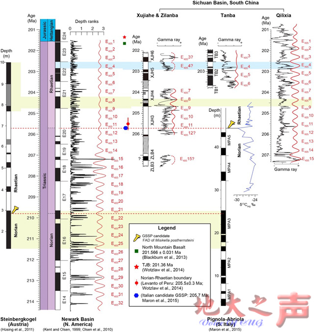 地球自转和绕太阳公转的天文轨道深刻影响了万年到十万年级别的全球气候变化和地层旋回韵律,同时地球磁场在过去频繁而全球同步进行倒转,这都为地层的定年和全球对比提供了可能和依据。长期以来,国际上晚三叠世的地质年代标准依赖于北美地区纽瓦克超群的天文旋回和古地磁极性年表。但是,北美标准的完整性和可靠性数十年来不断受到多个国际团队的挑战;对于晚三叠世的地质年代学,尤其是对晚三叠世末期的瑞替期持续时间一直存在巨大的争议,因此科学界迫切需要来自全球不同地区的研究检验北美标准的适用性。