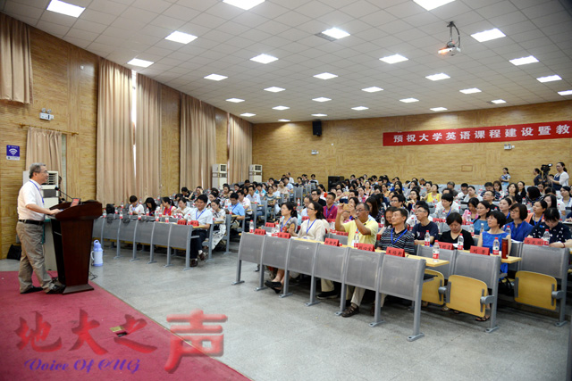 (地大之声记者庞伟红 摄影张玉贤)7月8日,大学英语课程建设暨教师发展研讨会在我校教三楼109教室召开。全国40余所高校的外语学院负责人,我校校长王焰新、相关单位负责人及外国语学院全体教师参加研讨会,共同研究大学英语课程建设及教师发展工作。