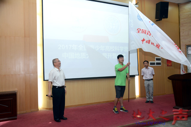 王焰新向志愿者代表授营旗,并宣布2017年青少年高校科学营中国地质大学分营正式开营。