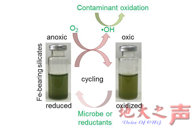 粘土矿物广泛分布于地下环境中。在地下厌氧环境中,粘土矿物可以通过还原态有机质、溶解态二价铁和微生物等的作用下发生化学或生物还原而形成还原态粘土矿物,其可以有效调控重金属、放射性离子环境行为和碳、氮等元素循环。事实上,在干湿交替,地下水补给和植物根系呼吸等作用的影响下,地下环境可能出现厌氧-好氧交替过程而导致还原态粘土矿物与氧气接触。尽管目前针对粘土矿物在厌氧条件下的还原机制及其对污染物转化展开了大量的研究,但是针对地下环境中还原态粘土矿物有氧条件下活化氧气及其环境效应却鲜有研究报道。