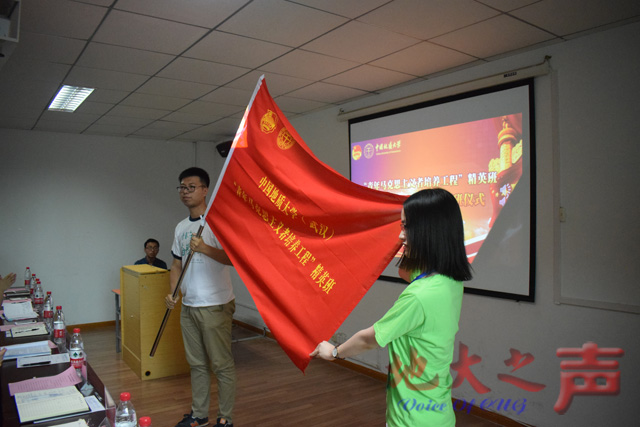 第七期学员代表王一洋和第八期学员代表陈佳雨交接了青马班班旗。陈佳雨同学说:“感谢学长学姐们为我们新一期的学员树立了良好的榜样,接过的班旗是一份信任与责任、使命和担当。新一期青马人一定不虚度青春、不负期望、不辱使命,不断坚定理想信念,锤炼高尚品德,用实际行动践行所作出的承诺。”