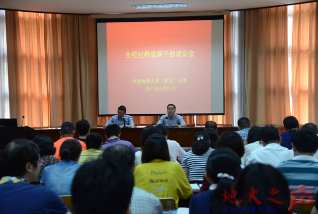 (地大之声通讯员高晓东 摄影张玉贤)5月22日,学校召开2017年纪检监察干部培训会。校党委书记何光彩,校党委副书记、纪委书记成金华,各二级党组织纪委书记、纪委委员,二级党组织纪检委员,教职工党支部纪检委员,校纪委全体纪检监察干部参加培训会。