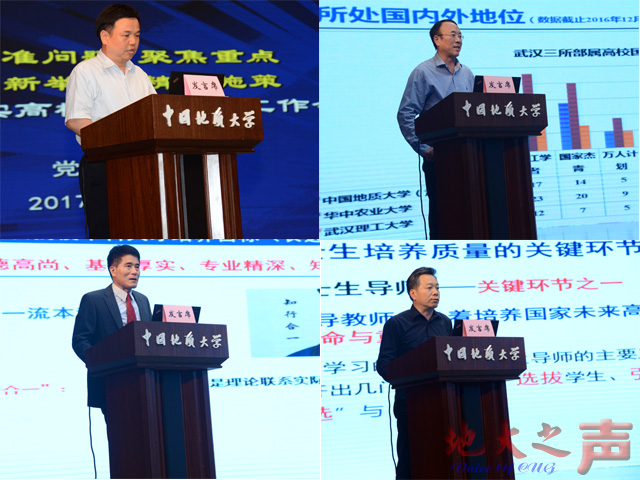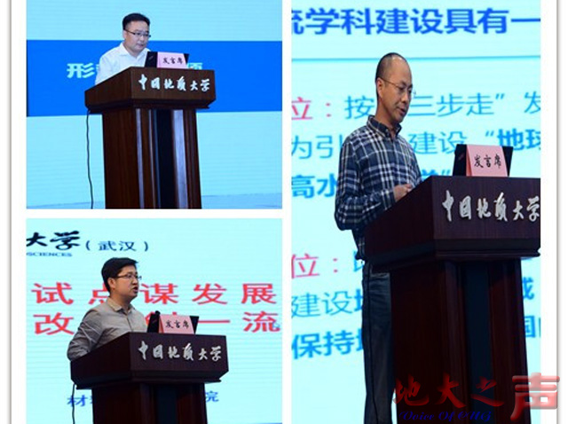 围绕大会主题,党委宣传部部长喻芒清、人事处处长张宏飞、教务处处长殷坤龙、研究生院常务副院长周爱国分别作了《找准问题 聚焦重点 创新举措 精准施策 全面贯彻落实高校思想政治工作会议精神》《追求学术卓越,建设高水平师资队伍》《从“目标”走向“实现”——谈一流本科人才培养》《严格培养要求,创新培养模式,不断提高博士研究生培养质量》的发言;地球科学学院院长刘勇胜、材料与化学学院院长夏帆、计算机学院院长王力哲先后作了《新起点、新思维、新高度——地质学一流学科建设的思考与思路》《以试点谋发展,以改革创一流》《提高人才培养质量,建设高水平计算机学科》的发言。