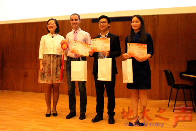 吴小莺参赞(左一)为迪米特•迪米特诺夫(左二)和何俊杰(右二)颁奖