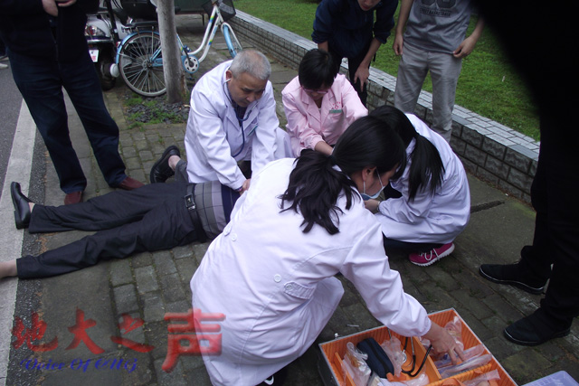 与此同时,校医院主任医师朱乐夫、医师桑娟、护士长蒋巧辉、护士冯天杰已坐上保卫处副处长单红峰派来的巡逻车,背着急救箱、氧气包,拿着血压计迅速赶了过来,给老人进一步抢救。“快!给他做心肺复苏!”朱乐夫喊道。他一下车,立刻蹲下来给老人进行持续的胸部按压,其他医护人员也各就各位,做着各种应急准备。