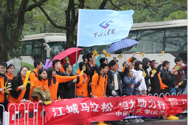 李四光学院、经济管理学院和工程学院各派出40名志愿者一起组成志愿啦啦队,为参赛选手们加油鼓劲,给予精神鼓励。比赛当天,120名志愿者比赛开始前便已就位,顶风迎雨,等待着选手们的到来。来自经管学院的刘禹婷是本次汉马志愿啦啦队的一员,汉马参赛者拼搏的身影让她印象深刻,“看到了参赛的残疾人,还有很多老爷爷,虽然他们速度并不快,但他们一直在坚持。我被他们超越自我、超越极限的精神所震撼,希望自己能好好锻炼,有朝一日也能参加汉马。”