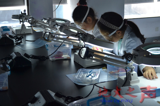 在逸夫博物馆“达尔文实验站”内,小朋友们穿上了白大褂、戴着护目镜,在专业老师的指导下进行化石修复,俨然成为了一个个小科学家。