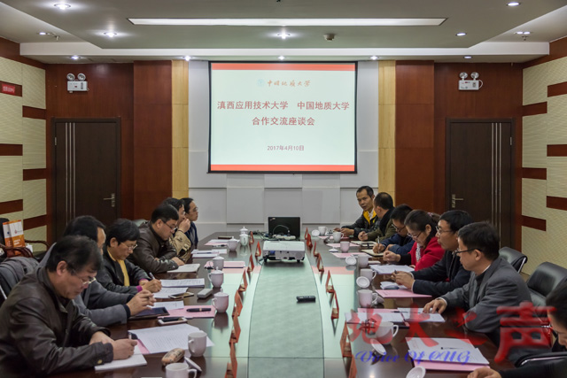 (地大之声记者徐燕 摄影范庆贺)4月10日下午,滇西应用技术大学(以下简称“滇西大”)党委书记罗进忠、校长周跃、副校长杨丽宏一行来校,就对口帮扶工作进行交流。校党委副书记朱勤文,相关学院、职能部门负责人参加座谈。