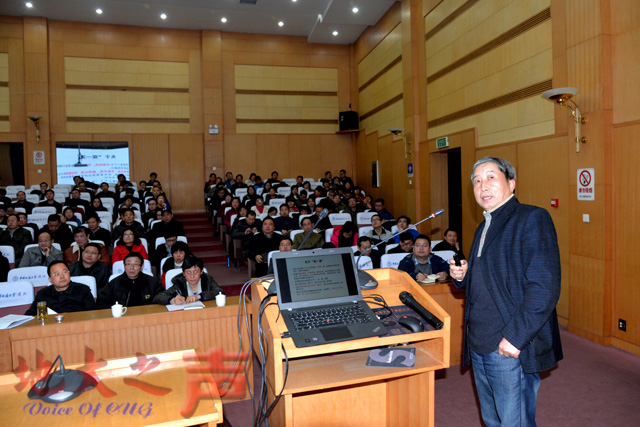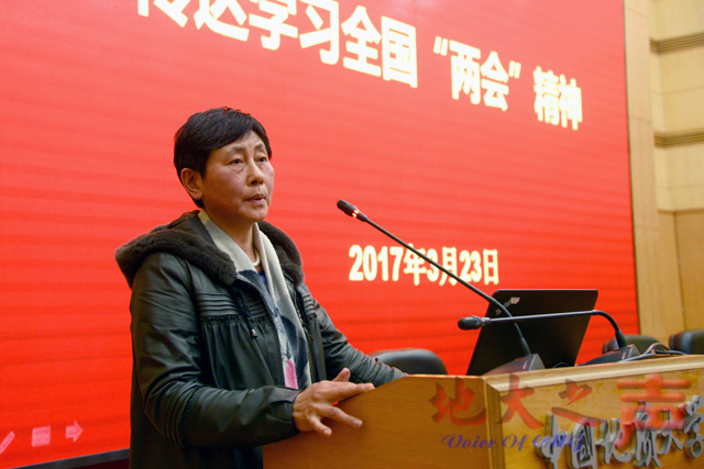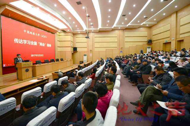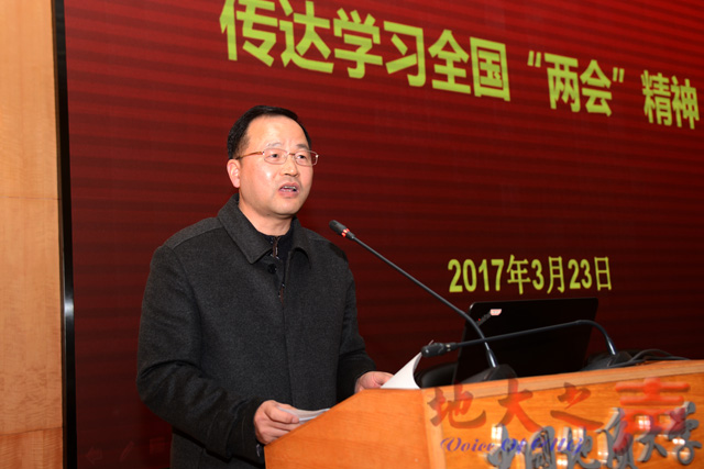 (地大之声记者庞伟红 摄影张玉贤)3月23日,我校学习传达全国“两会”精神。第十二届全国政协委员李长安教授,以参会者的亲身经历,对全国“两会”精神作了传达。在校校领导何光彩、朱勤文,全校副处以上干部、各民主党派主委及无党派代表人士、离退休教职工代表、马克思主义学院全体教师、机关科级干部及学生代表聆听了报告。校党委副书记朱勤文主持了学习报告会。