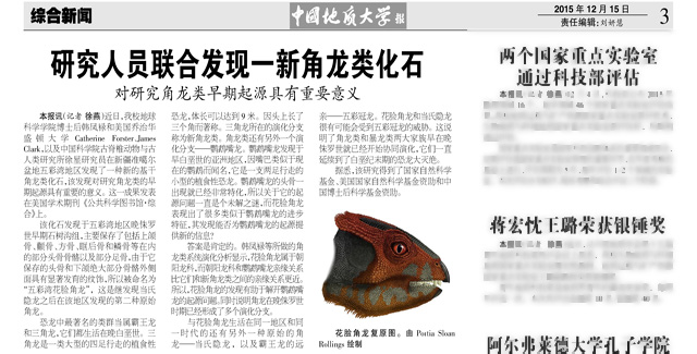 2015年12月,记者得知我校研究人员联合发现一新角龙类化石这一新闻线索后,迅速采访了我校地球科学学院相关老师,重点采访了博士后韩凤禄,得知这一新角龙类化石的发现对研究角龙类的早期起源具有重要意义。记者采访结束后,及时向总编辑汇报了采访情况,并撰写成稿,使本条新闻得以及时见报。