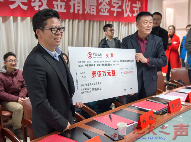 傅安洲代表学校接受捐赠支票,并向刘鹏颁发了捐赠证书。他指出,刘鹏用奋斗和才干开创事业,用品牌在国际上赢得消费者信任,彰显了“品德高尚,基础厚实,专业精深,知行合一”的地大人形象,希望广大同学向刘鹏学习,为国家、社会做出更大贡献。