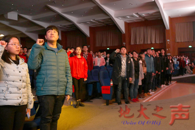 分享会上,全体志愿者起立宣誓:为志愿服务事业无私奉献,传承志愿者精神。