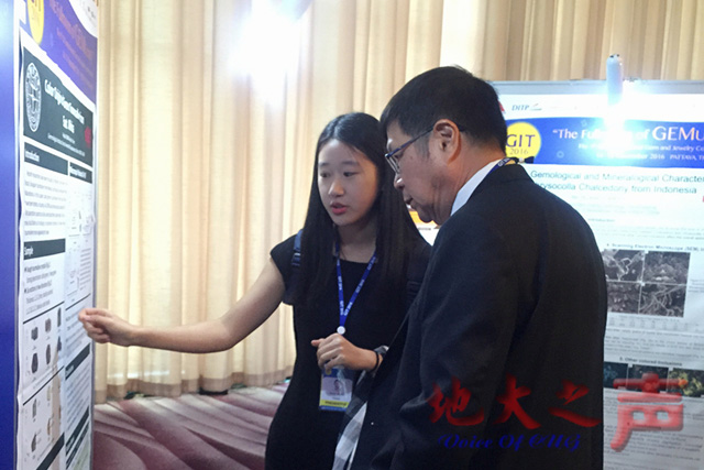 海报展示一共52份,主要涉及宝石和贵金属矿床类、创新性宝石鉴定类、优化处理及合成类、宝石质量评估类、首饰设计类等。珠宝学院的两名博士研究生叶敏、胡洋,两名研究生张志清、仲佩佩分别参与了海报展示环节。