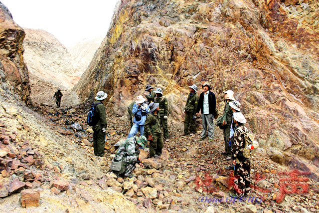 每天清晨6点,天刚蒙蒙亮,学生们就早早起床,吃过早餐后,准备好地质包、地质锤、罗盘、掌上机、GPS、地质图以及午餐之用的馒头、火腿等,分成三个小分队,乘坐2—3个小时的车程,前往昆仑上腹地漫山遍野地“寻宝”。出发前,许荣科老师如同军事指挥官一样,对同学们的装备进行逐一检查,反复叮嘱安全事项后,车队方可开拔。当然,他也和同学们一样,一起前往野外。