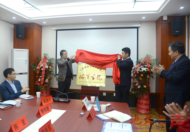 海洋学院教师代表任建业、姜涛为海洋学院揭牌。