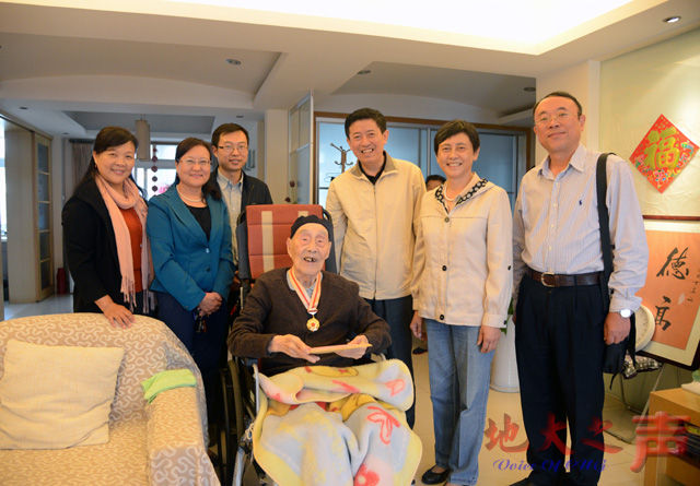 近日,带着上级部门和领导的嘱托,校党委书记郝翔、党委副书记朱勤文,相关部门负责人来到田苏家中,为他送上纪念章,并帮老人佩戴好,同时送上慰问金。郝翔向田苏表示诚挚问候和崇高敬意,亲切询问老人的身体健康状况和日常生活情况。他说:“老同志为民族独立、人民解放和新中国建立立下了不朽功勋,是党和国家的宝贵财富,我们今天的好日子都是他们用信仰和信念铸就的、用鲜血和生命换来的。我们要以革命前辈为榜样,学习他们坚如磐石的理想信念、百折不挠的英雄气概、敢于胜利的革命风范,为推进学校全面建成地球科学领域世界一流大学作出应有贡献。”
