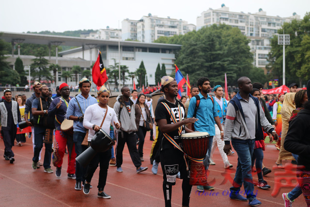 伴着振奋人心的《运动员进行曲》,各个方阵依次走过主席台。海洋学院学子们上下舞动着长蓝带,仿佛蔚蓝的海浪翻滚,寓意着海洋学子“长风破浪会有时,直挂云帆济沧海”的壮志。机电学子手持小锤、丁字尺、机械制图,诠释了机械学子的专业精神。体育课部的同学们背着登山包、挂上攀岩绳,意气风发地走向看台,铭记攀岩精神,一路向上高飞。轻快的鼓点声,色彩斑斓的服饰,国际教育学院的上百名外国留学生表现出不一样的异域风情。不同的肤色与信仰,同样的地大精神与传承,“独行快,众行远,共谱和平美好生活新篇章”的红色条幅传达留学生对各国和谐相处,共同发展进步的美好祝愿。