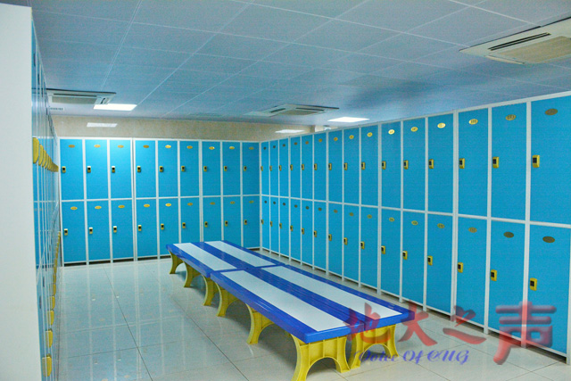 步入游泳馆北侧的大厅,沿楼梯向地下走去,便来到了更衣室。米白色的瓷砖、天蓝色的衣柜,整洁明亮。每个衣柜均设电子锁,钥匙可系于手腕。