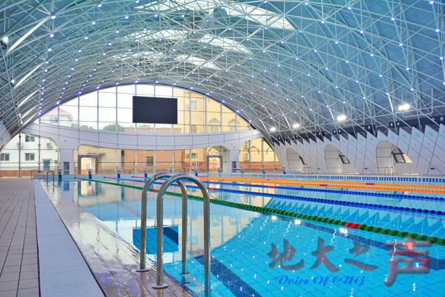 游泳馆顶部的数百盏LED灯与池水辉映,宛如星空,在武汉各游泳馆中独树一帜。泳池宽25米、长50米,底部铺设的可拆式垫层将其划分为6条2米的深水泳道和4条1.4至1.6米的浅水泳道,可满足训练、承办比赛等多种需要。水温24小时维持在26摄氏度,地暖、空调除湿设备可保证场馆一年四季可用。泳池水采用自动循环水处理技术,通过泳池四周的排水沟进入水质监测和处理设备。
