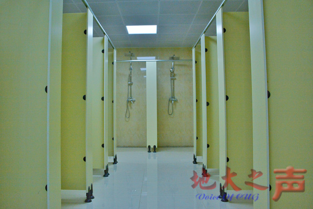 沿着更衣室往下走是淋浴区,24小时提供热水,同时设有残疾人浴室和无障碍卫生间。出口处设有全自动淋浴消毒装置,有人通过时便会自动喷淋,拾级而上即可进入游泳馆内。