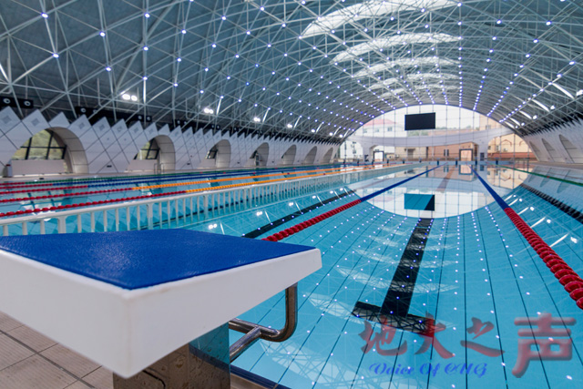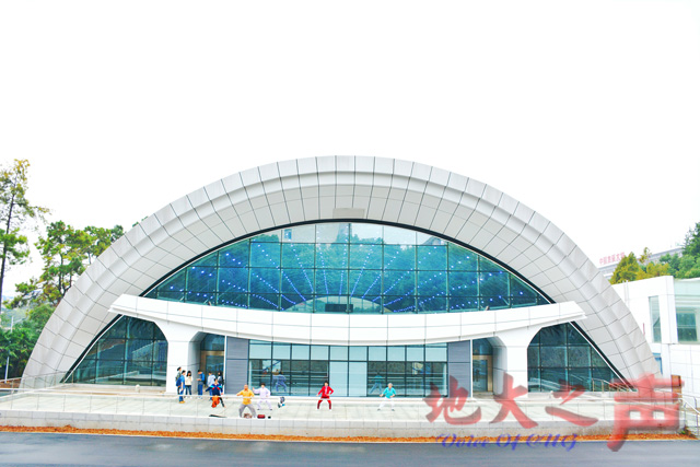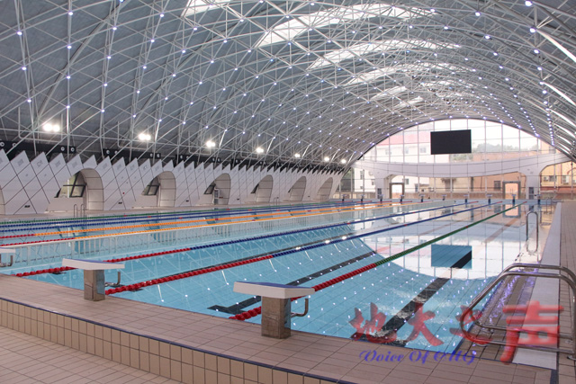 向东走下地大天桥,右手边一栋高约15米,长约75米的白色壳状建筑映入眼帘,完工在即的地大新游泳馆静静伫立着。